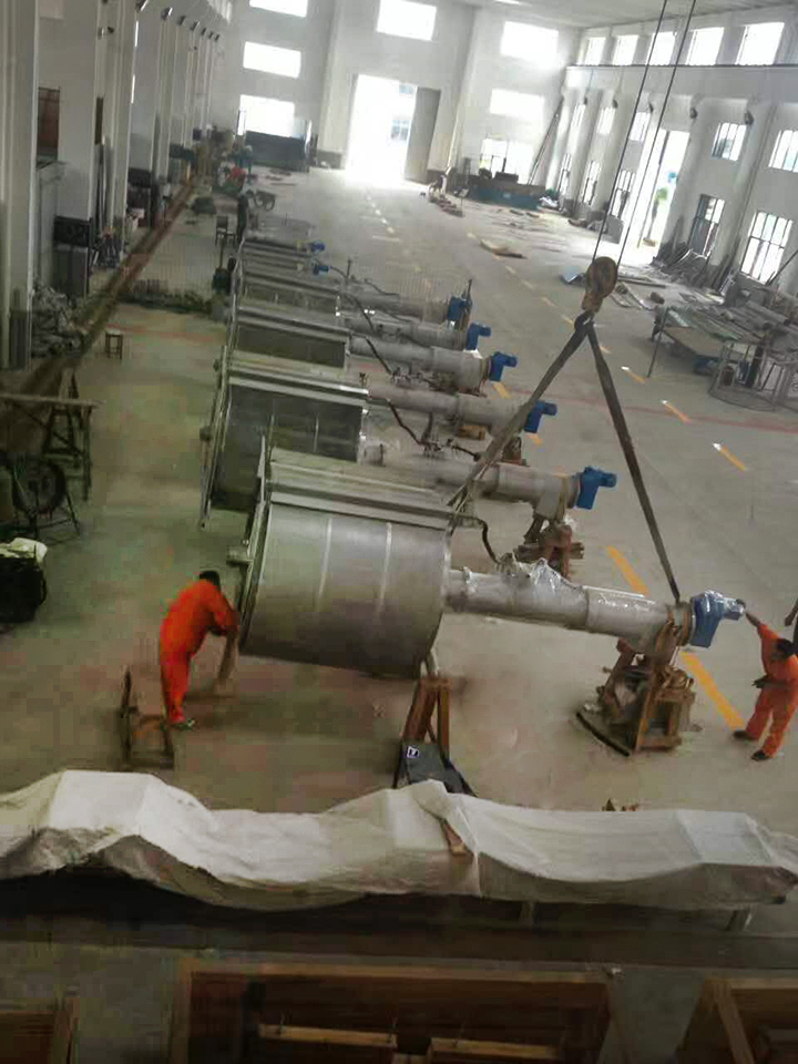 該設(shè)備與水平面成35度安裝在水渠中,污水從轉(zhuǎn)鼓的端頭流入鼓中,水通過轉(zhuǎn)鼓側(cè)面的柵縫流出,格柵將水中的懸浮物、漂浮物等留在轉(zhuǎn)鼓中,轉(zhuǎn)敏以一定的速度旋轉(zhuǎn),鼓的上方有尼龍刷和沖洗水噴嘴,將柵渣清除井通過螺旋輸送運轉(zhuǎn)擠干,脫水,運至上端排料斗,經(jīng)輸送機運走。